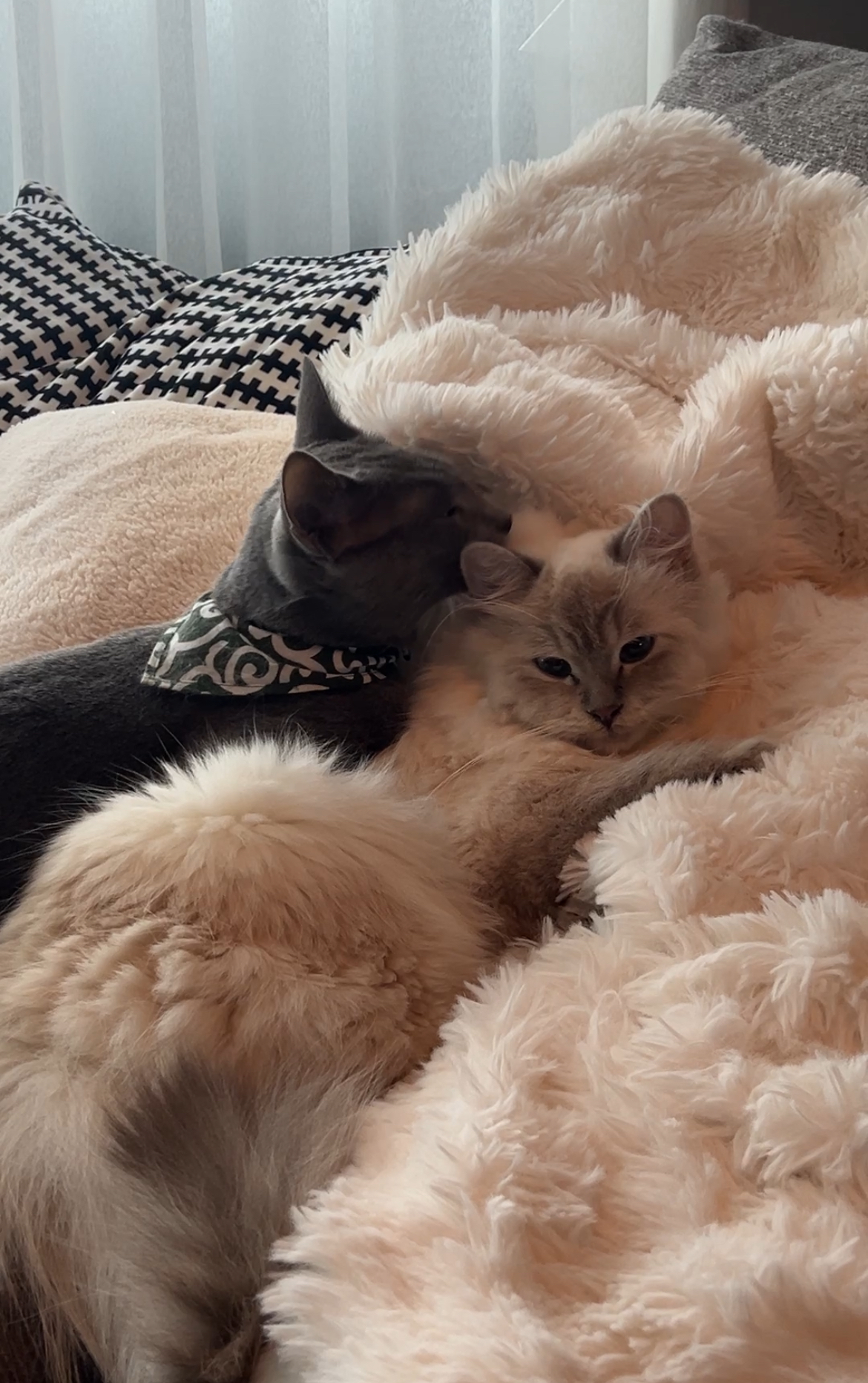 我が家では猫と一緒には寝ていないのですが、朝起きてリビングへいくとたまにこうして2人で仲良くくっついています。